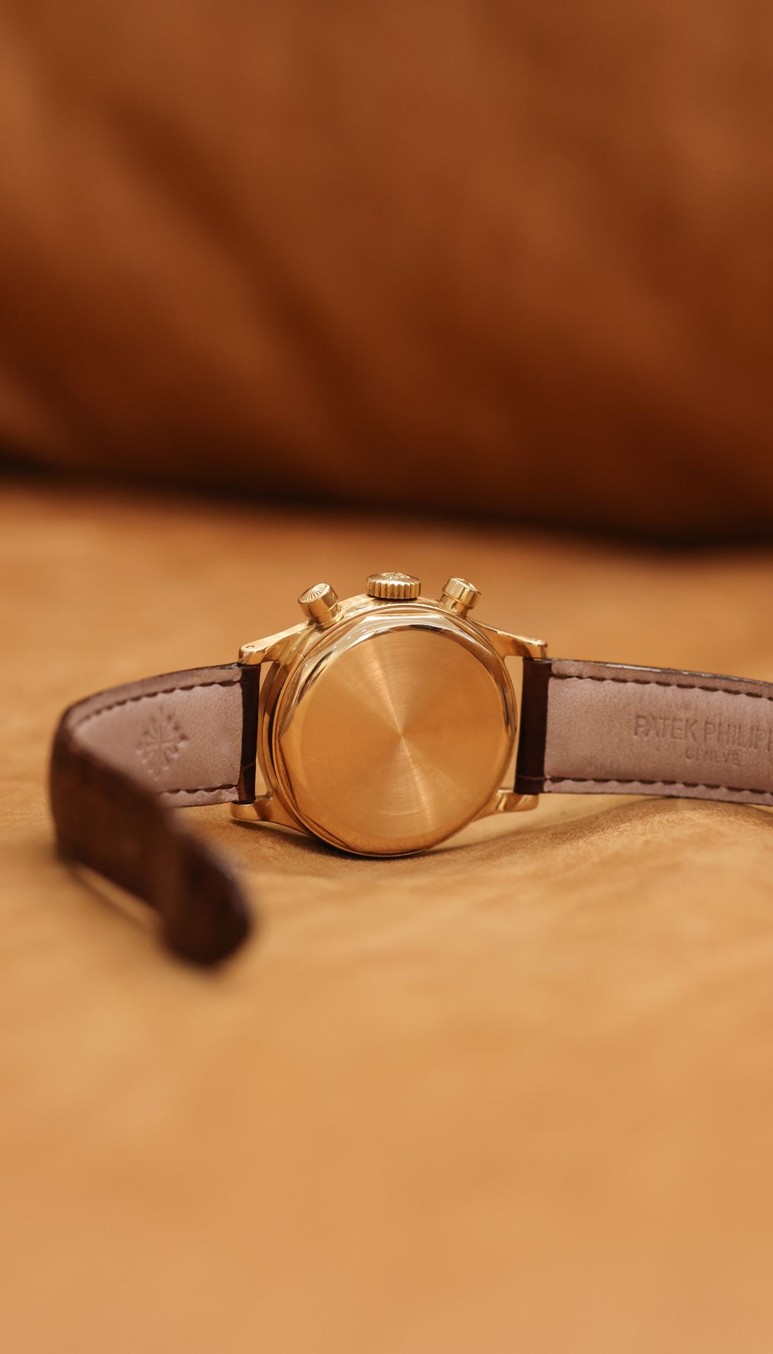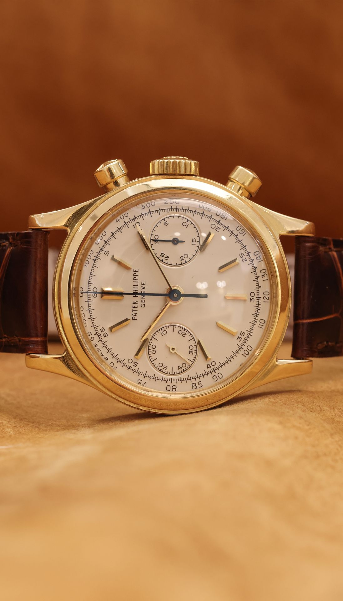 Launched in 1940, the Reference 1463 was the first water resistant chronograph created by Patek Philippe. This Reference was fitted with a screwback case, instead of the more common snapback, and dust metal cover protecting the movement.