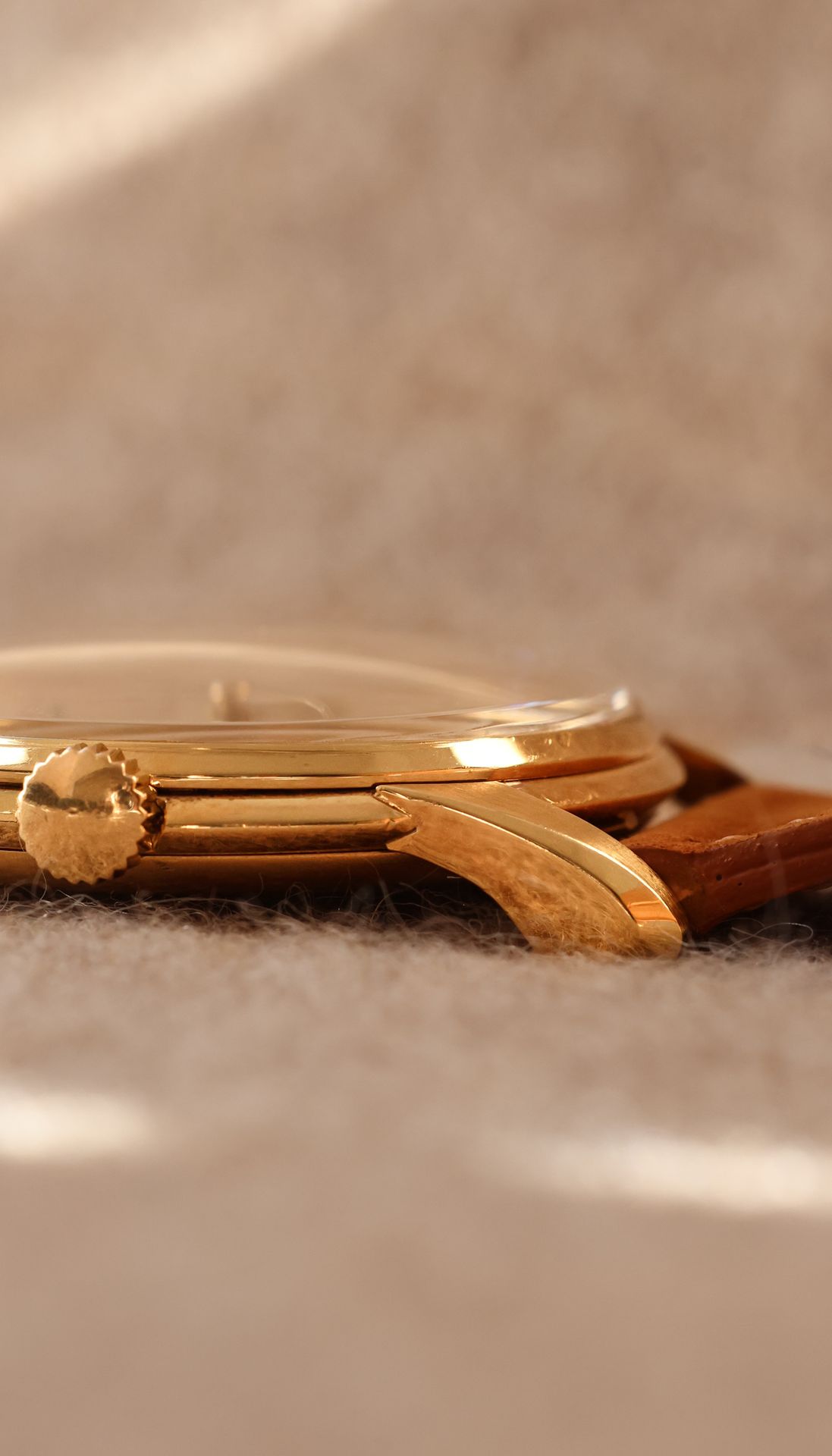 The reference 1569 was introduced in 1943 and remained in production for approximately six years. Offered in yellow and pink gold, it stands out as one of the very few wristwatches of its era to feature a 36 mm case, a notably large diameter for the time.