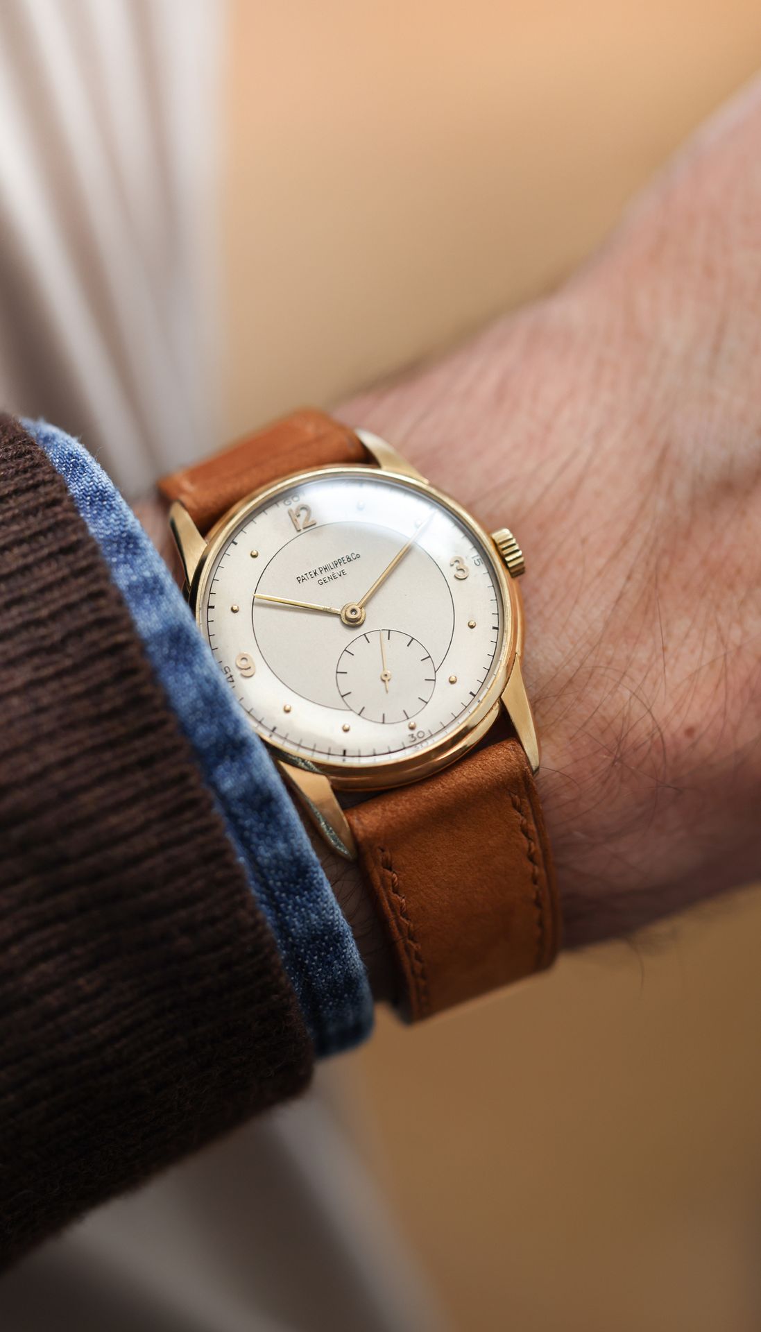 The reference 1569 was introduced in 1943 and remained in production for approximately six years. Offered in yellow and pink gold, it stands out as one of the very few wristwatches of its era to feature a 36 mm case, a notably large diameter for the time.