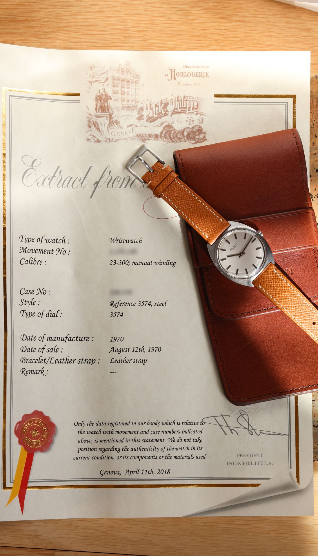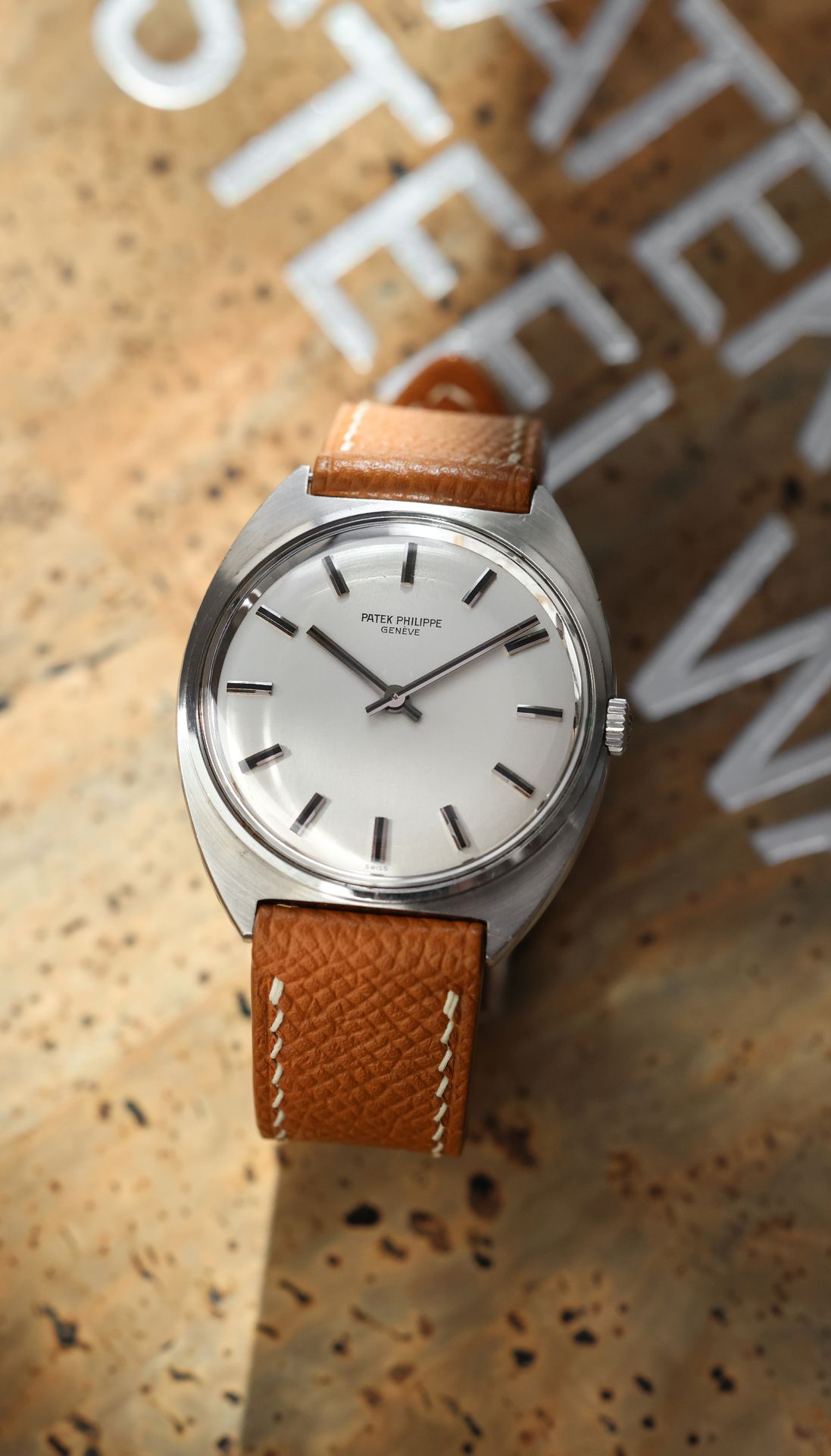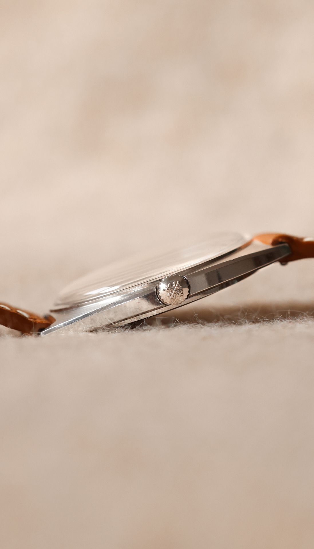 The reference 3574, produced approximately for four years, is a rare departure from the brand’s traditional designs. Crafted exclusively in stainless steel, it features a case design that captures the industrial elegance of the time.