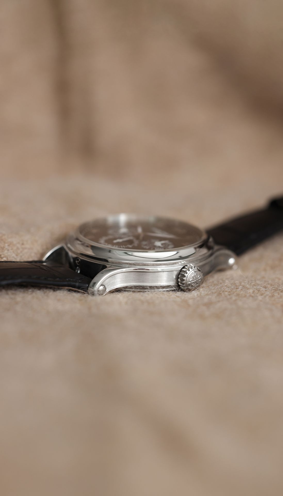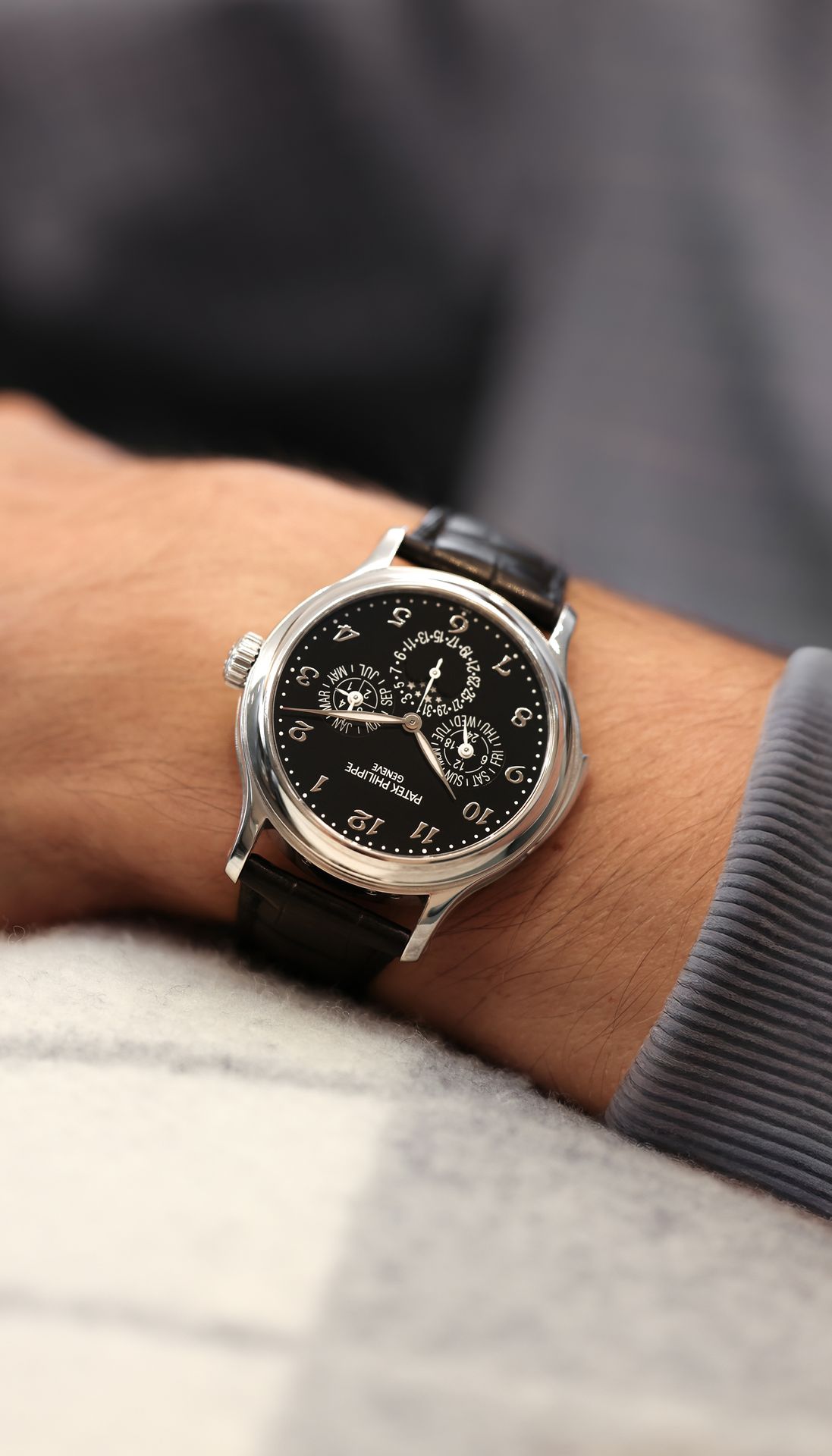 The reference 5374P-001 Grand Complication with minute repeater and perpetual calendar combines technical excellence and elegance in a platinum version with a black enamel dial. The case shape is distinguished by its subtle interplay of curves and its concave bezel. The minute repeater with its “cathedral" gongs wrapping almost twice around the movement is distinguished by its rich, deep sound.