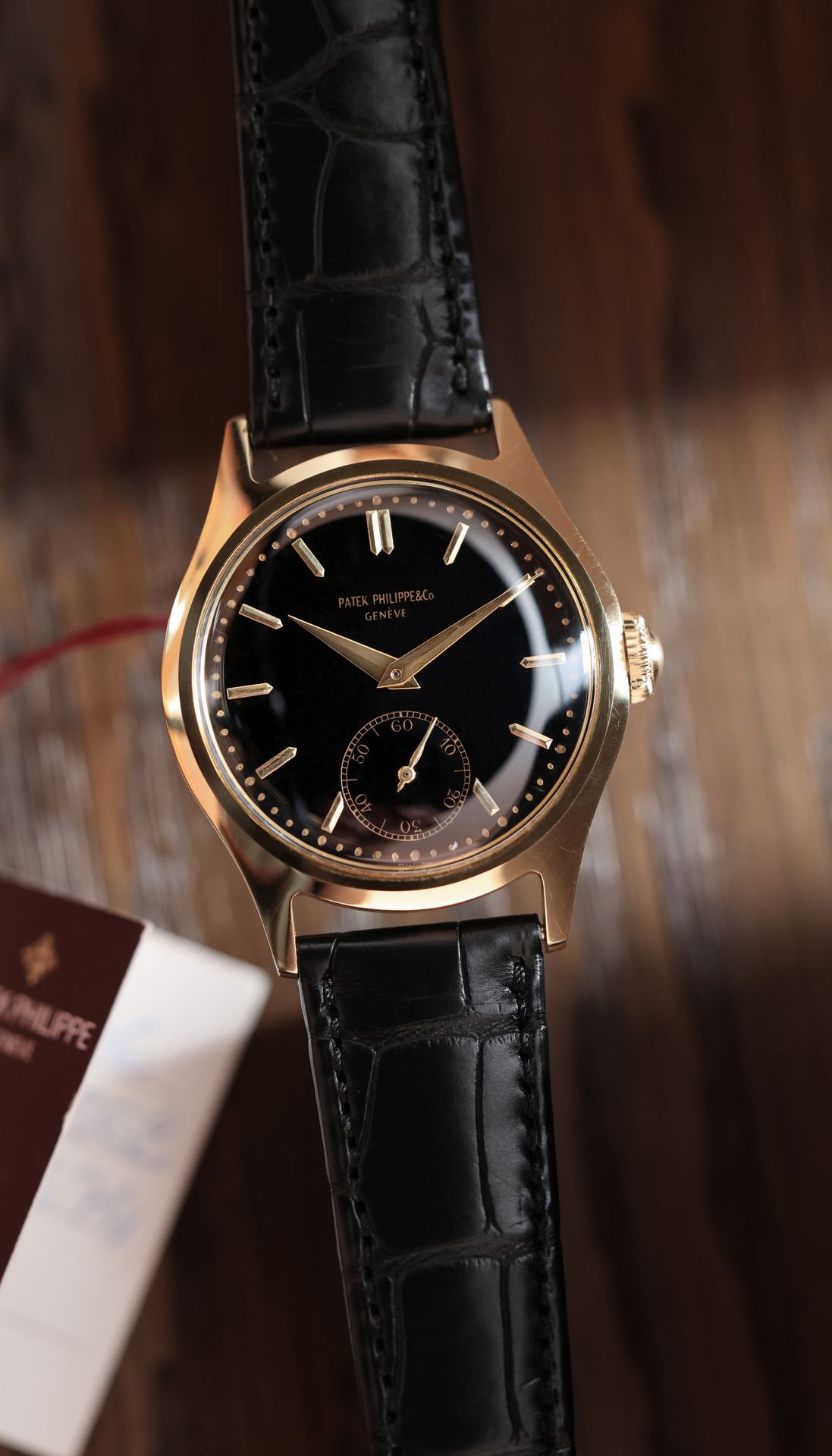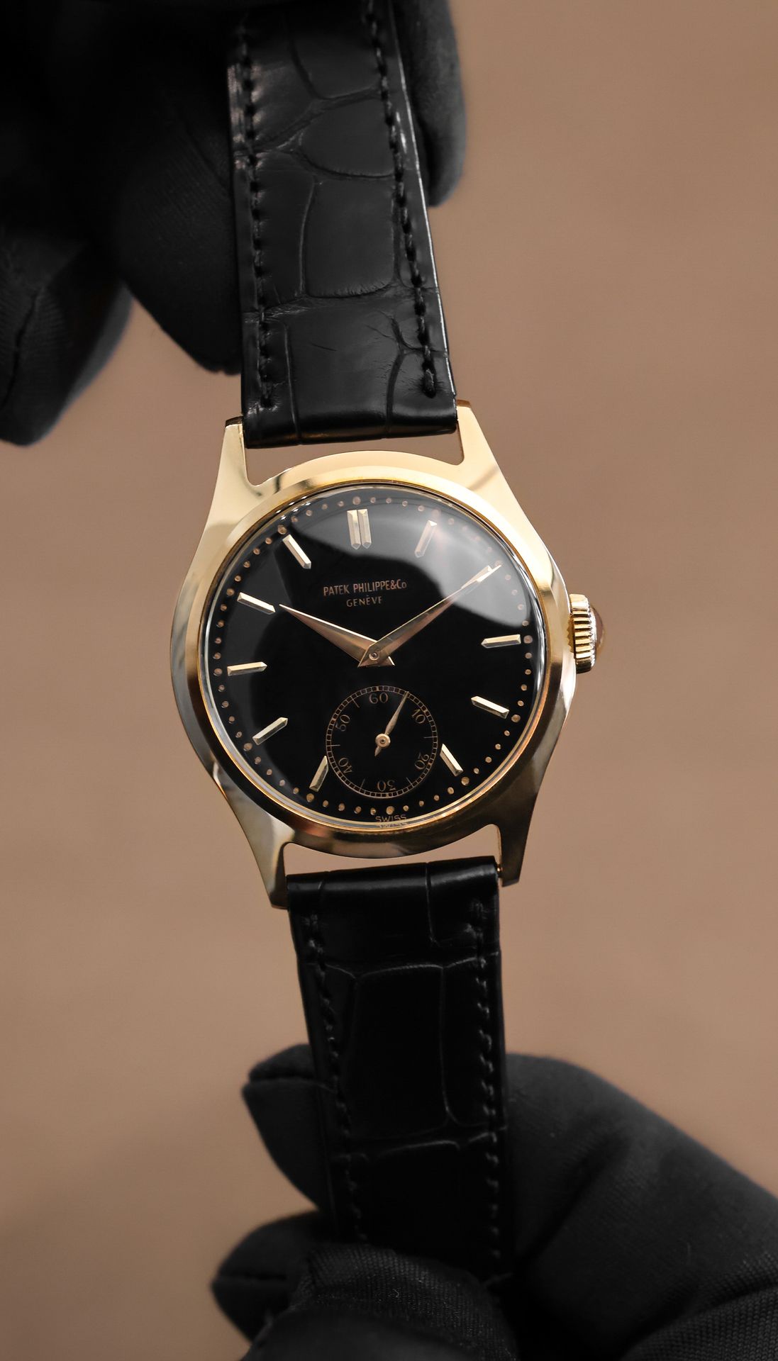 The present example from 1952 features a yellow gold case in good condition and an extremely rare black dial with applied gold indexes and the “long signature” (PATEK PHILIPPE&Co).
