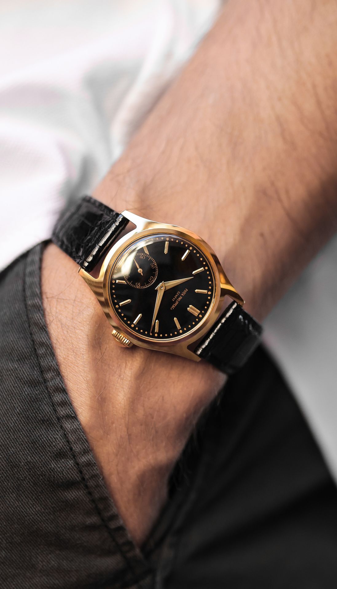 We believe that the original buyer bought the watch with a white dial in 1952 but decided to have it changed to a black one by Patek Philippe. Would it be too crazy to assume, that Patek Philippe still had a black “long signature” dial somewhere in their basement?