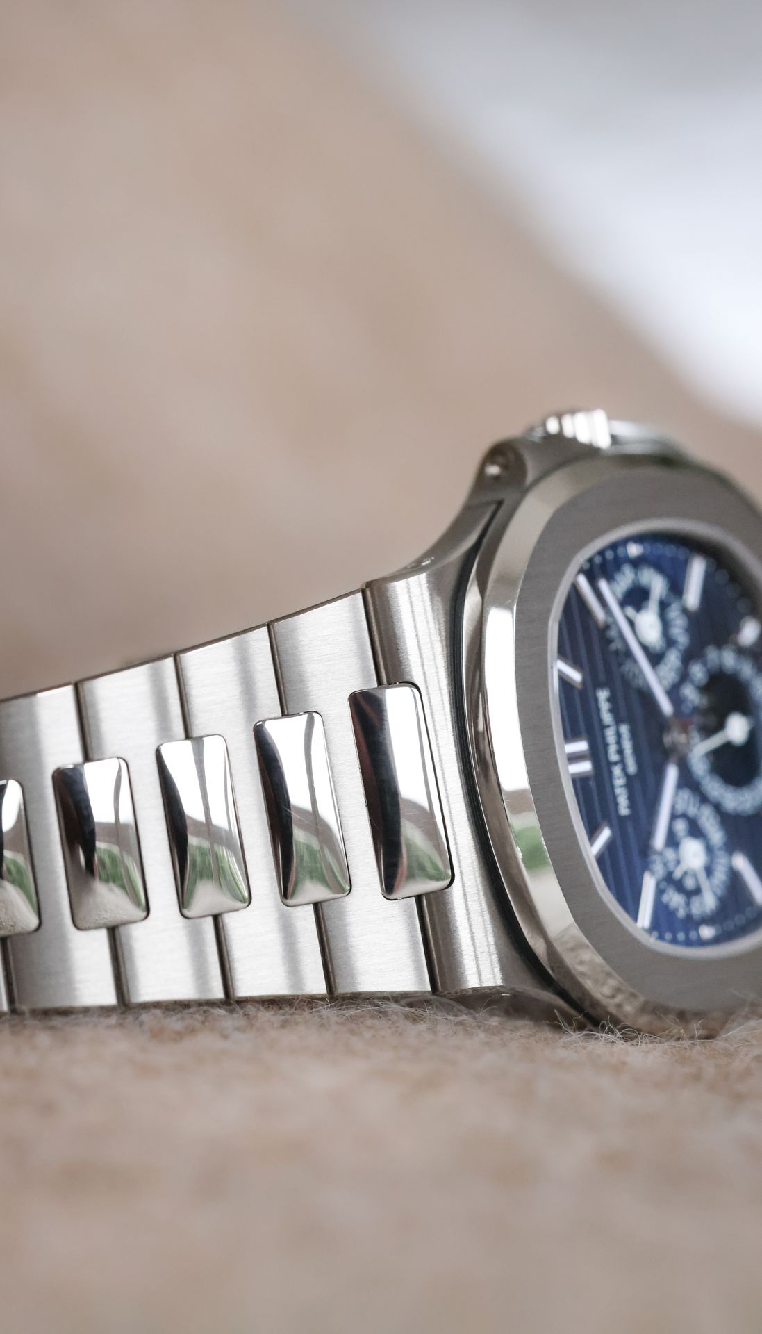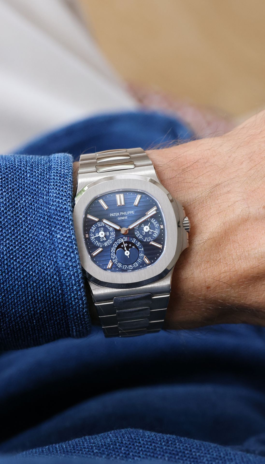 Introduced in 2018 as the first Grand Complication in the Nautilus collection, this white gold perpetual calendar presents a distinctive fusion of sporty elegance and technical mastery. Powered by the renowned ultra-thin self-winding Caliber 240 Q, it maintains the remarkable slimness that makes it the thinnest perpetual calendar ever produced by Patek Philippe.