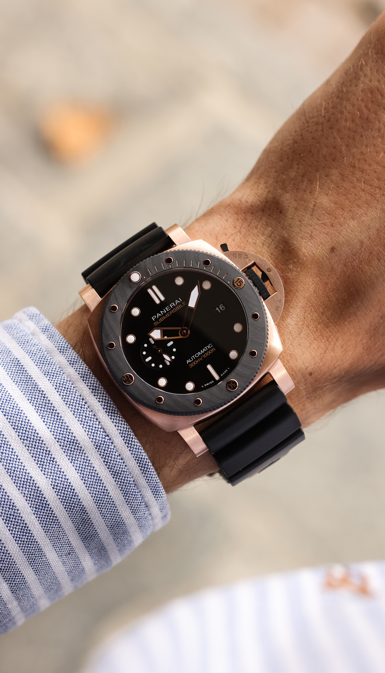 With the Submersible, Panerai renews with its great tradition of epic exploits in the depths of the sea. The design of the bezel is inspired by that of the watch created by Officine Panerai in 1956 for the Egyptian Navy known as “L’Egiziano”. This was an exceptionally large and robust watch with a case diameter of 60 millimeters.