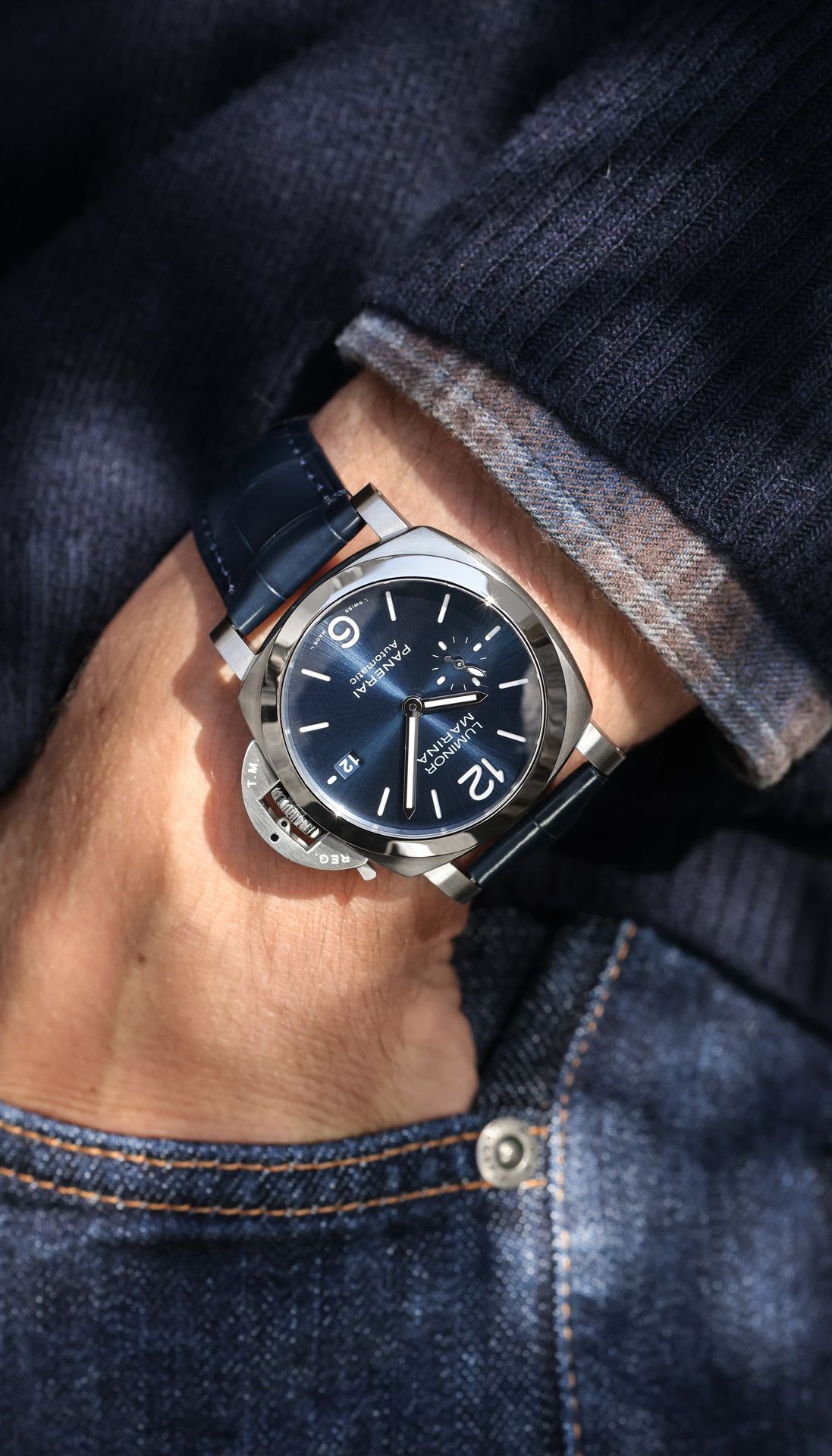 The Luminor Marina Quaranta is available with a stainless-steel case and three different dial executions possessing strong aesthetic identities, displaying a seconds sub-dial at 9 o’clock and the date at 3 o’clock. Each watch is accompanied by an alligator leather strap and a calf leather strap chosen to coordinate with their dial.