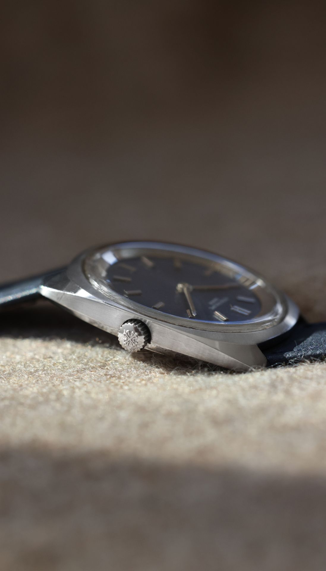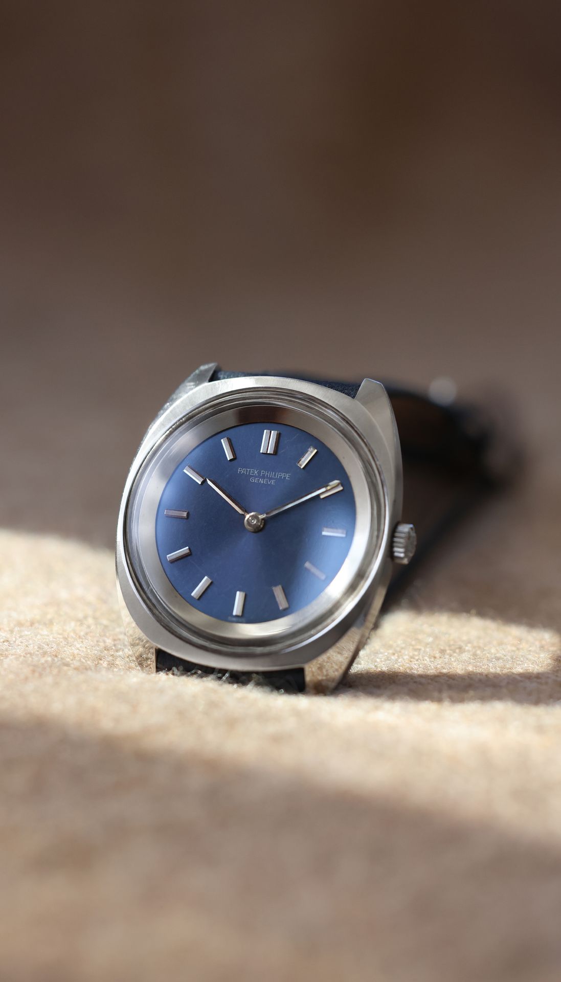 Introduced in 1969, the Patek Philippe reference 3579-1 embodies the creative design approach of the time. Its cushion-shaped stainless-steel case balances brushed and polished surfaces, creating dynamic reflections on the wrist.