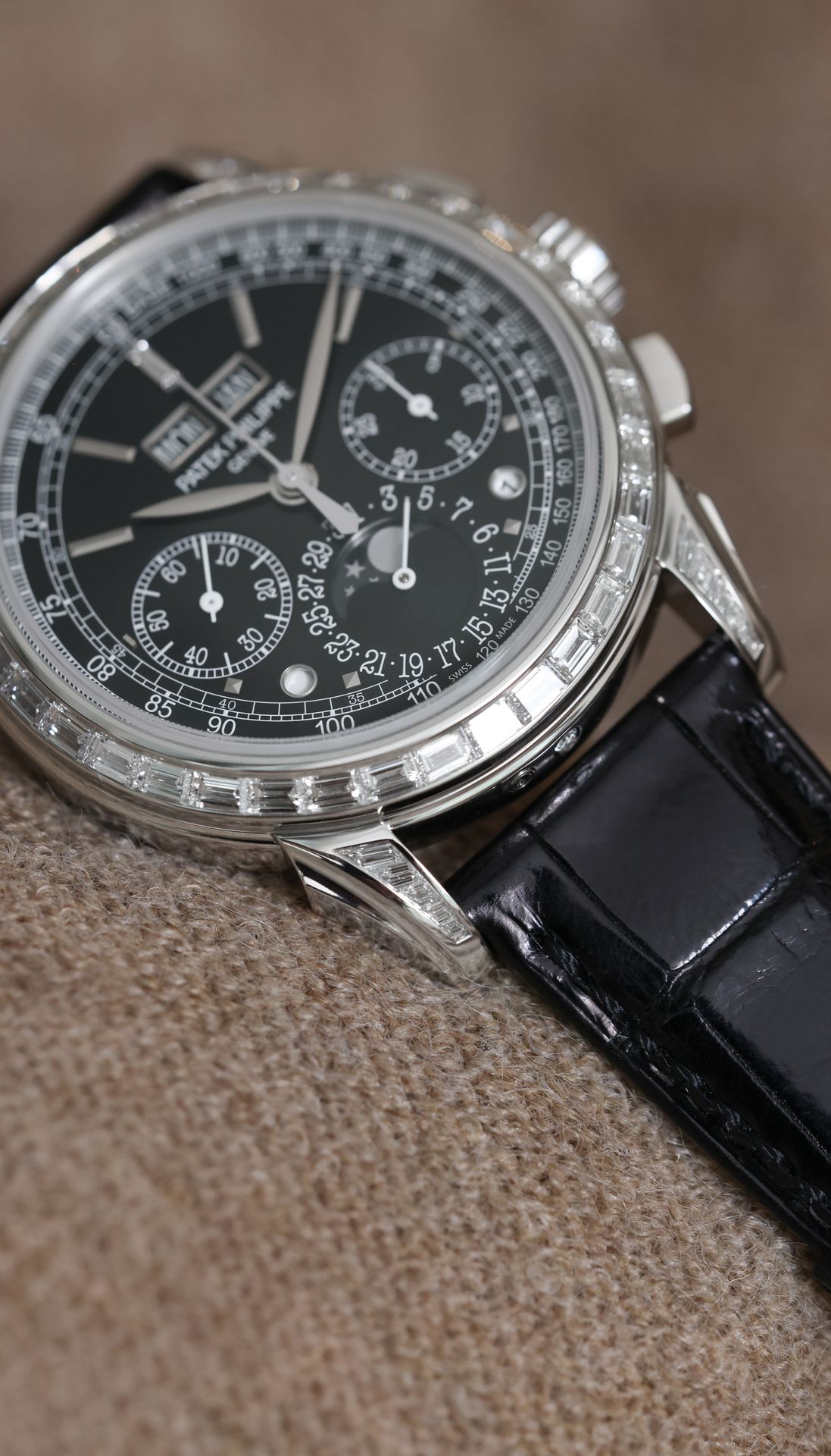 The Patek Philippe 5271P-001 embodies the perfect combination of mechanical complexity and haute joaillerie. This rare and exclusive perpetual calendar chronograph is set with 80 baguette-cut diamonds totalling approximately 4.84 carats, with a single diamond at the 12 o'clock marker. The diamond-set platinum 5271 perpetual calendar chronograph was introduced at Baselworld 2014 and produced in very limited numbers, making it a rare and exciting discovery for collectors.