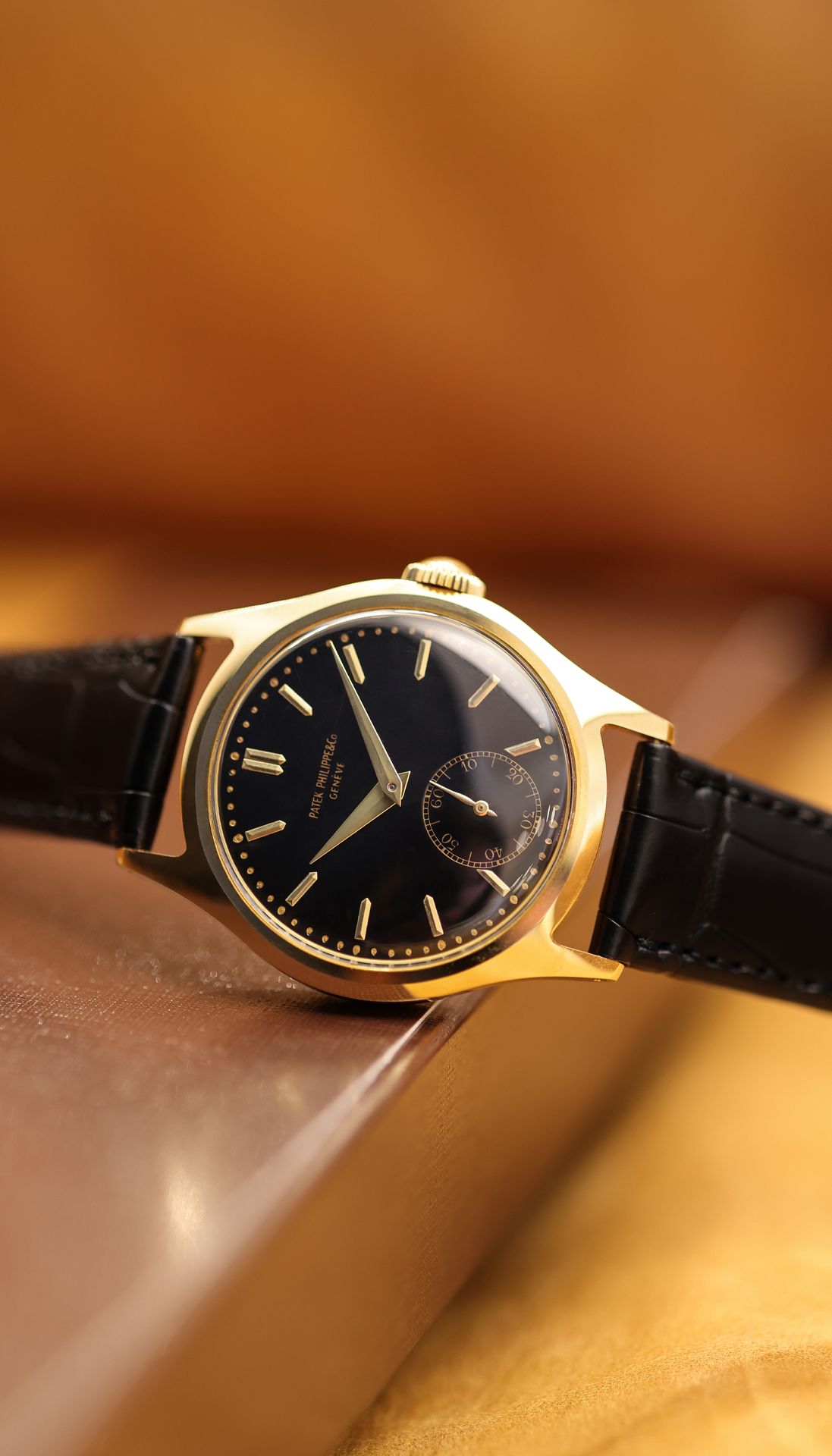 The present example from 1952 features a yellow gold case in good condition and an extremely rare black dial with applied gold indexes and the “long signature” (PATEK PHILIPPE&Co).