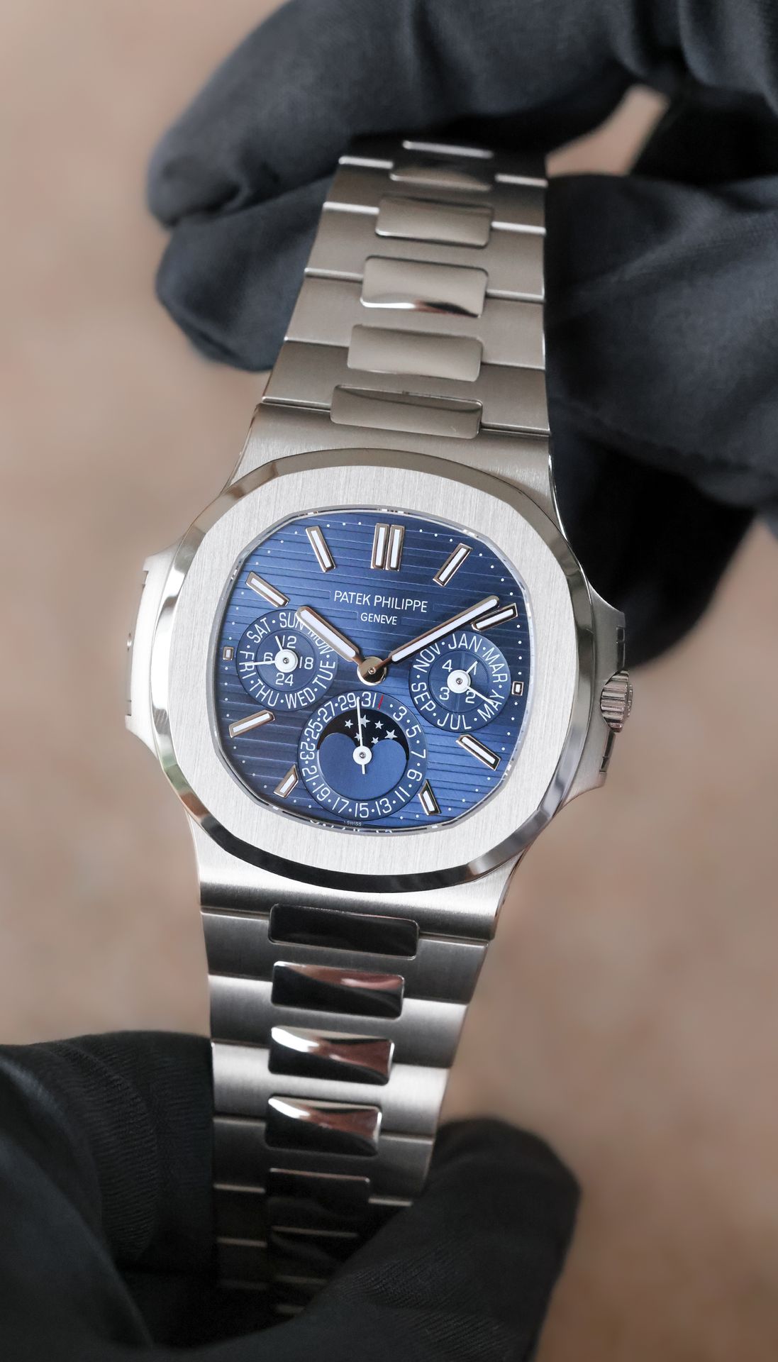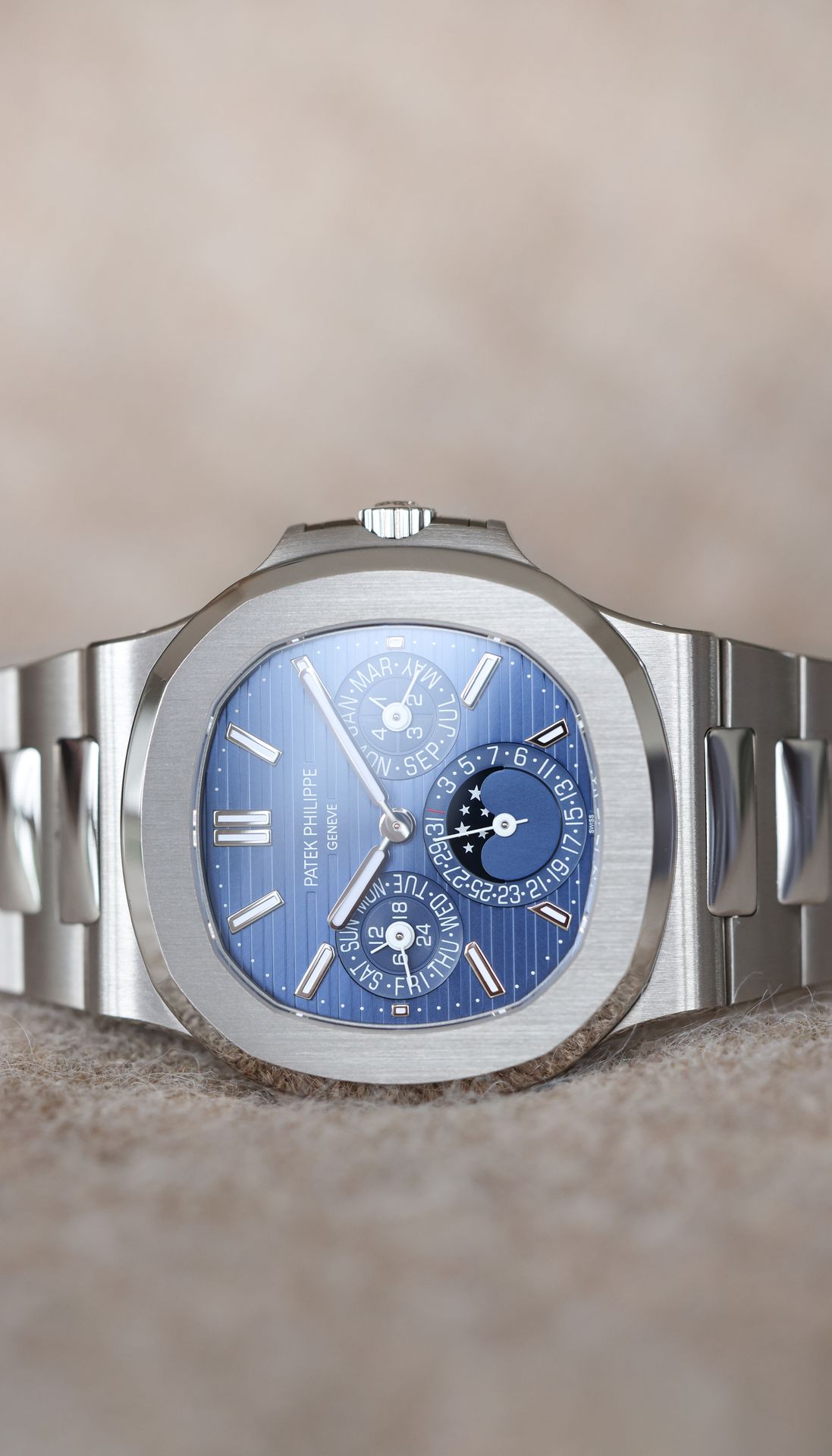 Introduced in 2018 as the first Grand Complication in the Nautilus collection, this white gold perpetual calendar presents a distinctive fusion of sporty elegance and technical mastery. Powered by the renowned ultra-thin self-winding Caliber 240 Q, it maintains the remarkable slimness that makes it the thinnest perpetual calendar ever produced by Patek Philippe.